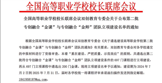 近日,全國高等職業(yè)學校校長聯(lián)席會議雙創(chuàng)教育專委會公布了第二批專創(chuàng)融合“金課”與專創(chuàng)融合“金師”團隊立項建設名單,根據(jù)全國高等職業(yè)學校校長聯(lián)席會議雙創(chuàng)教育專委會《關于遴選建設高等職業(yè)學校第二批專創(chuàng)融合“金課”與專創(chuàng)融合“金師”團隊的通知》有關要求,經(jīng)評審遴選,我校高教研究室推薦申報的《視頻編輯制作》《老年護理》《大學生創(chuàng)新創(chuàng)業(yè)教育》等3門課程全部被確定為全國高等職業(yè)學校校長聯(lián)席會議雙創(chuàng)教育專委會第二批專創(chuàng)融合“金課”與專創(chuàng)融合“金師”團隊項目立項建設。