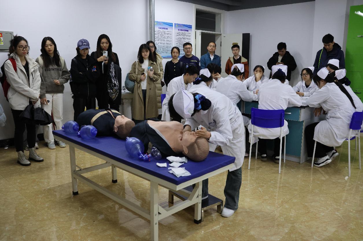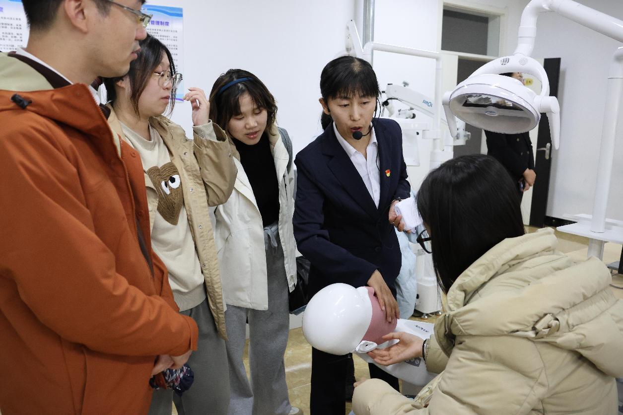 伊春職業(yè)學院旅游商務學院院長趙莉莉、黨支部副書記王寶才、教研室主任姚洪英、教師白天達陪同參觀交流活動。北京外國語大學師生先后參觀了興安磐古繩結(jié)技藝技能大師工作室和醫(yī)學實訓樓的口腔虛擬仿真實訓室、口腔臨床實訓室、中醫(yī)康復實訓室等教學實訓場所。