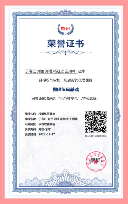 音樂教育教研室主任于春江老師帶領(lǐng)的音樂教育專業(yè)課程教學(xué)創(chuàng)新團(tuán)隊(于春江、劉蘭、劉瑾、楊繼欣、王海峰),于2023年2月完成網(wǎng)絡(luò)精品在線開放課程《視唱練耳基礎(chǔ)》的建設(shè),并被高職教學(xué)資源庫收錄。