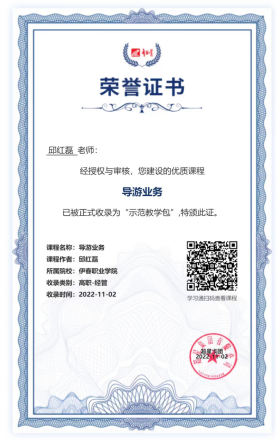 伊春職業(yè)學院旅游商務(wù)學院邱紅磊老師制作的線上課程《導游業(yè)務(wù)》因教學內(nèi)容豐富、課程體系合理、講解條理清楚、學習資料完整,經(jīng)超星公司組織專家評審,被超星平臺專家評為優(yōu)質(zhì)課程,正式收錄于超星“示范教學包”。