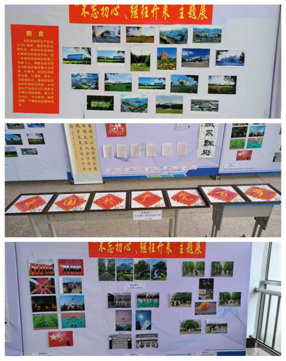 開展“不忘初心、繼往開來”主題展。挖掘校園思政元素,以攝影、散文、詩歌等形式,展現(xiàn)校園風采和對學校的熱愛,對中國共產(chǎn)黨成立 103 周年來光輝歷程的謳歌,展示不忘初心、牢記使命,胸懷理想、不辱使命的精神風采。