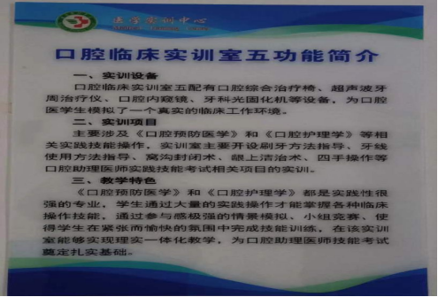 主要涉及《口腔預(yù)防醫(yī)學(xué)》和《口腔護(hù)理學(xué)》等相關(guān)實(shí)踐技能操作,實(shí)訓(xùn)室主要開設(shè)刷牙方法指導(dǎo)、牙線使用方法指導(dǎo)、窩溝封閉術(shù)、齦上潔治術(shù)、四手操作等口腔助理醫(yī)師實(shí)踐技能考試相關(guān)項(xiàng)目的實(shí)訓(xùn)。