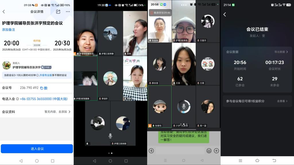 為進(jìn)一步加強(qiáng)對(duì)學(xué)生實(shí)習(xí)工作的組織管理,強(qiáng)化安全意識(shí),保障實(shí)習(xí)期間學(xué)生實(shí)習(xí)順利進(jìn)行,6月26日至6月27日,護(hù)理學(xué)院組織召開了實(shí)習(xí)生安全教育主題班會(huì)。班會(huì)采用線上會(huì)議的方式,由各實(shí)習(xí)班輔導(dǎo)員主持,覆蓋全體實(shí)習(xí)生。