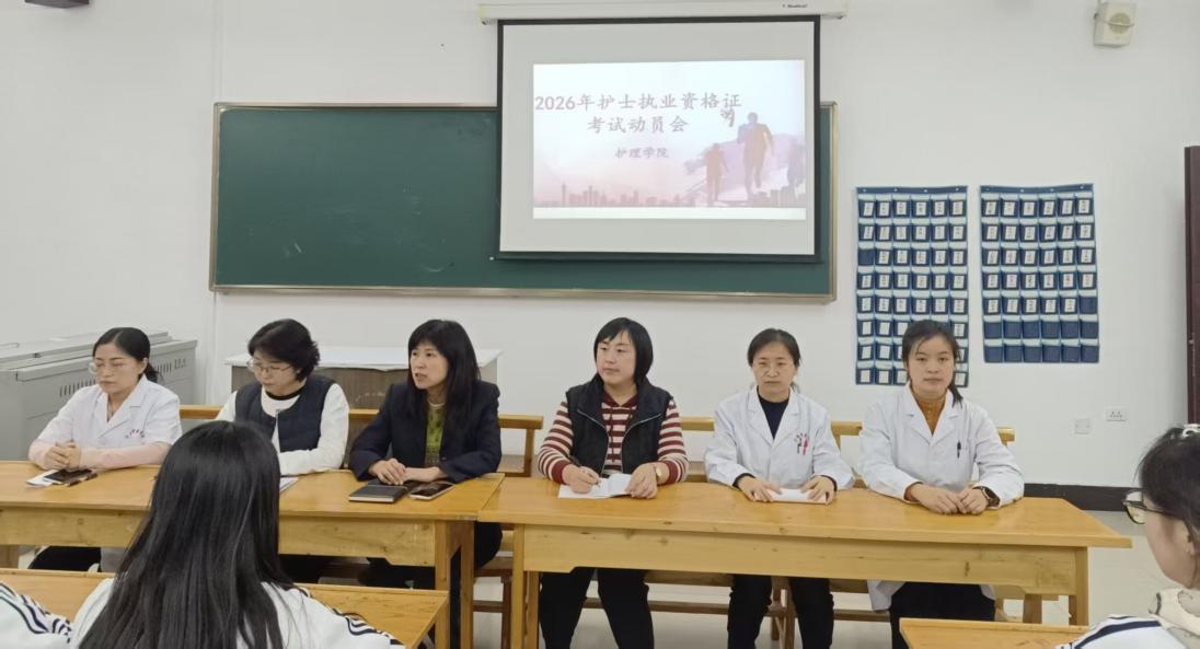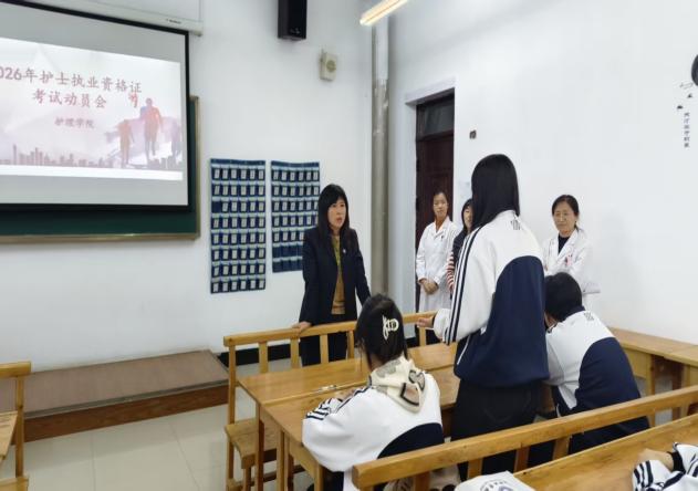10月29日下午,護(hù)理學(xué)院在1號(hào)教學(xué)樓召開2026年護(hù)士執(zhí)業(yè)資格證考試動(dòng)員會(huì),旨在收集教學(xué)意見和建議、分析成績(jī)問題、明確改進(jìn)方向并部署教學(xué)工作。會(huì)議由護(hù)理學(xué)院院長(zhǎng)韓金華主持,護(hù)理學(xué)院黨支部書記趙麗娜、護(hù)考培訓(xùn)教師、輔導(dǎo)員及2025級(jí)護(hù)理3+2中高職貫通培養(yǎng)高職階段9-12班全體學(xué)生參會(huì)。
