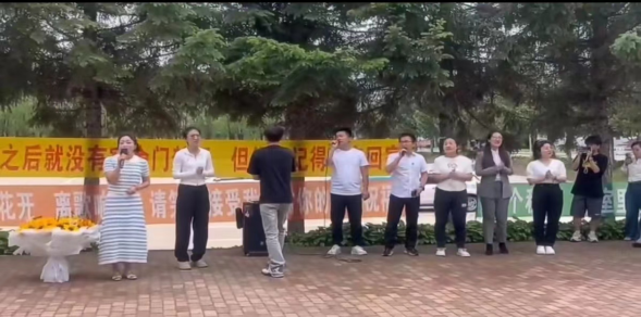 中午放學(xué)時(shí)分,精彩的節(jié)目在教學(xué)樓門前拉開(kāi)帷幕。學(xué)生代表深情演唱了《起風(fēng)了》《北京東路的日子》《不說(shuō)再見(jiàn)》等歌曲,這些熟悉的旋律勾起了同學(xué)們無(wú)數(shù)美好的回憶,也唱出了大家對(duì)校園生活的不舍和對(duì)未來(lái)實(shí)習(xí)生活的憧憬。緊接著,全體輔導(dǎo)員們登臺(tái),合唱了《再見(jiàn)》和《祝你一路順風(fēng)》,他們用歌聲表達(dá)了對(duì)同學(xué)們深深的祝福與不舍,現(xiàn)場(chǎng)氛圍十分溫馨感人。