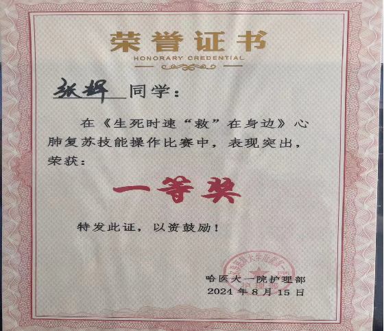 8月15日,哈爾濱醫(yī)科大學(xué)附屬第一醫(yī)院舉行了2024年護(hù)理實(shí)習(xí)護(hù)士“生死時(shí)速‘救’在身邊”心肺復(fù)蘇技能大賽。我校護(hù)理學(xué)院實(shí)習(xí)學(xué)生張輝同學(xué)最終以出色的表現(xiàn)榮獲一等獎(jiǎng)。