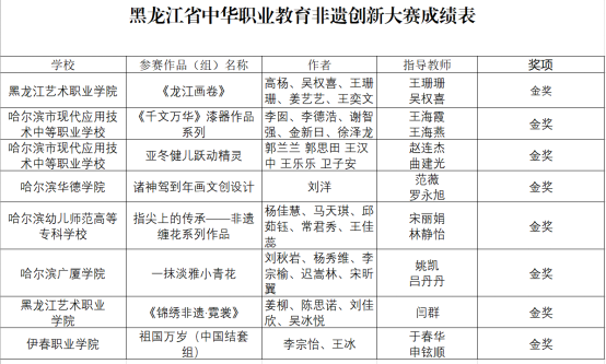 首屆黑龍江省中華職業(yè)教育非遺創(chuàng)新大賽共有20所院校、82個(gè)項(xiàng)目、391名師生參加現(xiàn)場(chǎng)決賽,分為工藝美術(shù)組和演藝組兩組進(jìn)行評(píng)比,參賽團(tuán)隊(duì)按照賽場(chǎng)分區(qū)搭建展臺(tái),評(píng)審專家根據(jù)現(xiàn)場(chǎng)觀摩和座談評(píng)議情況進(jìn)行打分。最終,8個(gè)項(xiàng)目榮獲金獎(jiǎng)、16個(gè)項(xiàng)目獲銀獎(jiǎng)、20個(gè)項(xiàng)目獲銅獎(jiǎng)。