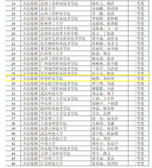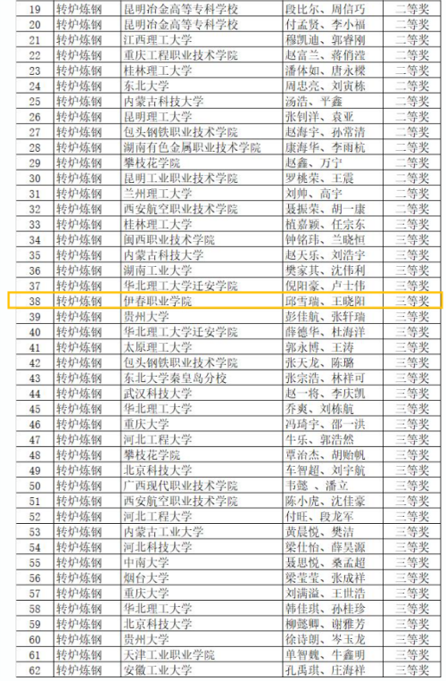 本屆競賽參賽學(xué)校共44所,其中高職???4所(煉鋼23組46人,煉銅23組46人),本科院校(含研究生)30所(煉鋼51組102人,煉銅34組68人)。煉鋼競賽項目:特等獎6組、一等獎10組、二等獎16組、三等獎30組;煉銅競賽項目:特等獎5組、一等獎7組、二等獎12組、三等獎22組。