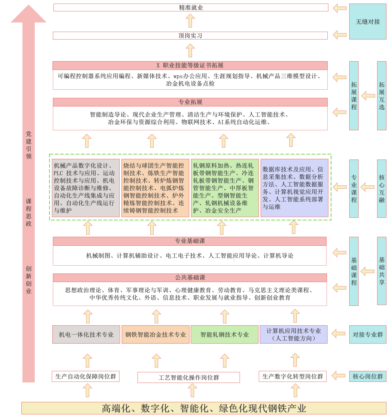 推動群內(nèi)專業(yè)教學(xué)課程體系多維度交叉融合,實(shí)現(xiàn)相關(guān)專業(yè)課程資源互融共享。引入企業(yè)真實(shí)項(xiàng)目,根據(jù)企業(yè)真實(shí)項(xiàng)目和崗位需求,及時更新課程內(nèi)容,補(bǔ)充行業(yè)前沿動態(tài),開發(fā)新課程,以適應(yīng)行業(yè)智能化發(fā)展趨勢。通過以上的努力,實(shí)現(xiàn)課程內(nèi)容與企業(yè)需求的深度對接,培養(yǎng)出符合鋼鐵冶金產(chǎn)業(yè)需求的高技能人才。專業(yè)基礎(chǔ)課教學(xué)團(tuán)隊統(tǒng)一授課,培養(yǎng)群內(nèi)所有學(xué)生必備的基礎(chǔ)知識、基本技能;專業(yè)課教學(xué)團(tuán)隊協(xié)作進(jìn)行模塊化教學(xué),實(shí)現(xiàn)專業(yè)核心課程相互獨(dú)立,專業(yè)特色課程內(nèi)容相互融合、相互滲透,既培養(yǎng)學(xué)生具備各崗位群核心理論知識和職業(yè)技能,又滿足學(xué)生個性化學(xué)習(xí)需求,實(shí)現(xiàn)群內(nèi)生產(chǎn)操作、生產(chǎn)保障、數(shù)字化轉(zhuǎn)型三類崗位群崗位能力的交叉和遷移。構(gòu)建多維度交叉融合,相關(guān)專業(yè)課程資源互融共享的鋼鐵智能冶金技術(shù)專業(yè)群課程新體系。