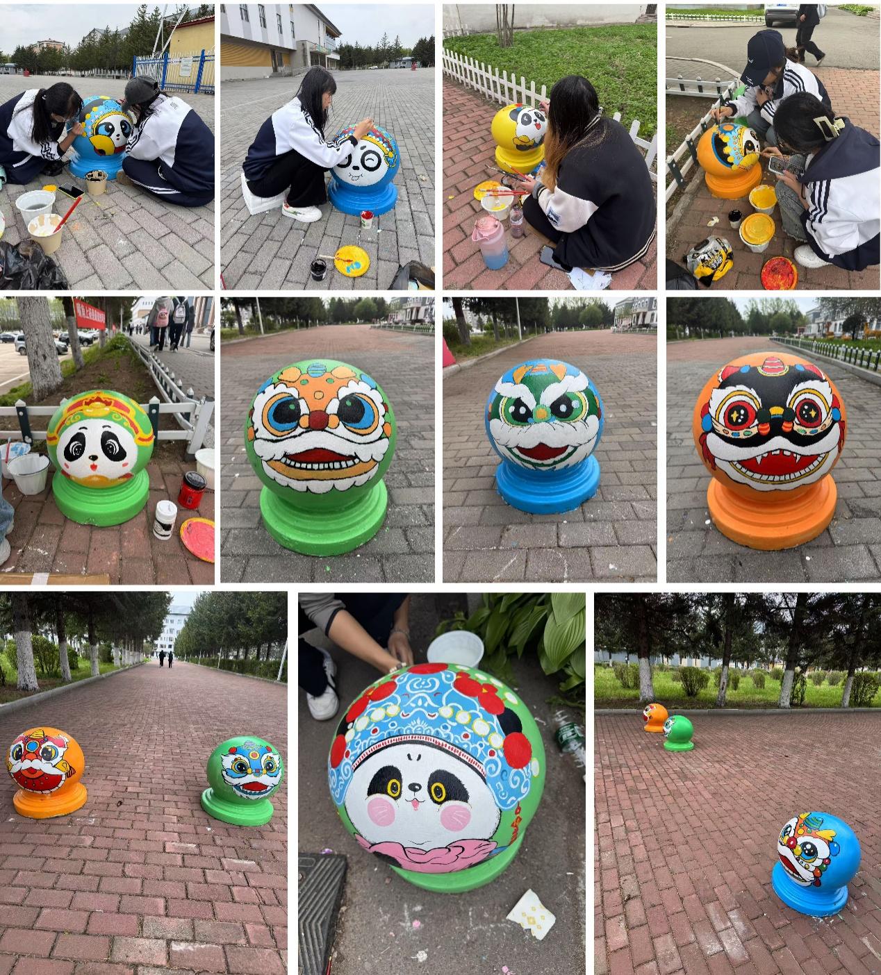 實踐活動三:在校園內(nèi)開展繪畫技法勞動實踐活動,師生們以傳統(tǒng)臉譜、國寶熊貓為創(chuàng)意元素繪制校園擋車石球。將專業(yè)教學和非遺文化勞動實踐相結(jié)合,創(chuàng)新教育教學方式,讓學生在實踐中更好地感悟匠心,錘煉品格,同時也是文化傳承的創(chuàng)新實踐。師生們借助石球的外形特點,構(gòu)圖、起形、調(diào)色、涂色等進行精心繪制,在繪制過程中,需要極具耐心、細心和專注力,在大家的努力下,一個個生動的形象出現(xiàn)在石球上,使石球瞬間充滿了生命的力量。通過繪畫實踐,使學生了解和傳承傳統(tǒng)文化的同時,能夠結(jié)合現(xiàn)代審美和創(chuàng)意,對傳統(tǒng)文化進行創(chuàng)新和發(fā)展,引導學生樹立正確的勞動觀,促進學生全面發(fā)展、健康成長。