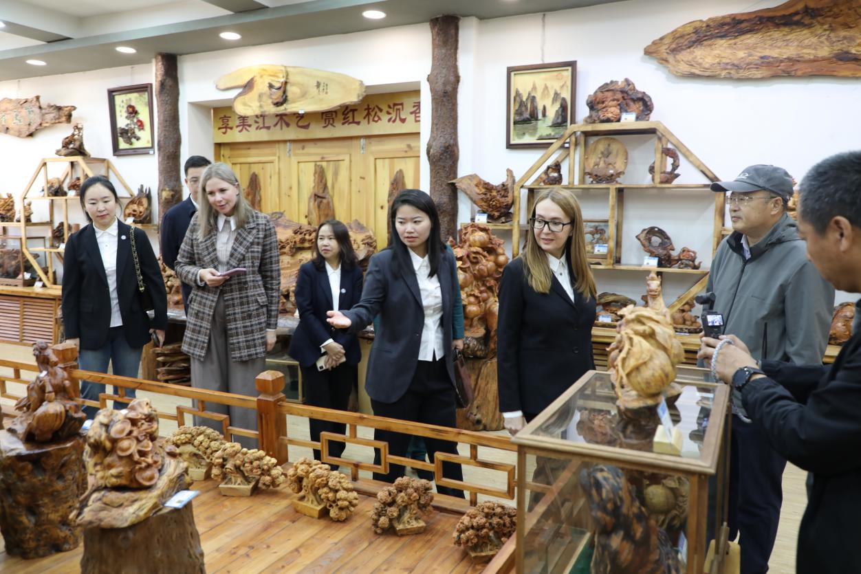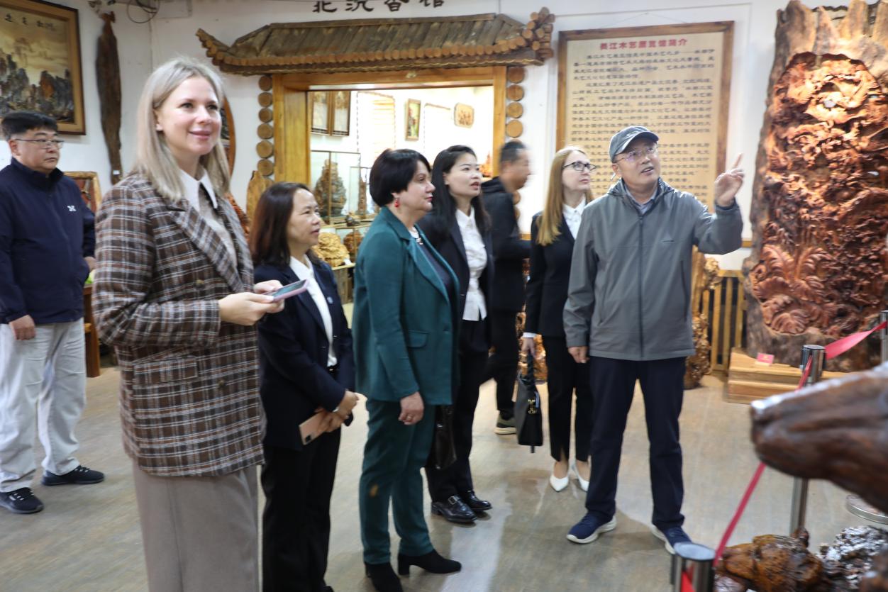 隨后,巴熱諾娃一行重點(diǎn)參觀了森林文化藝術(shù)創(chuàng)意展示中心。走進(jìn)展示中心,一件件精美的木藝作品讓人眼前一亮,北沉香擺件紋理獨(dú)特、香氣淡雅,木拼畫作品色彩層次豐富、畫面栩栩如生,山核桃創(chuàng)意作品則將山核桃變廢為寶,展現(xiàn)出濃郁的北方森林文化特色。