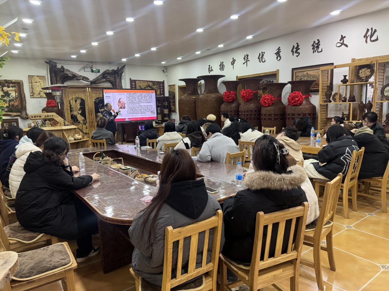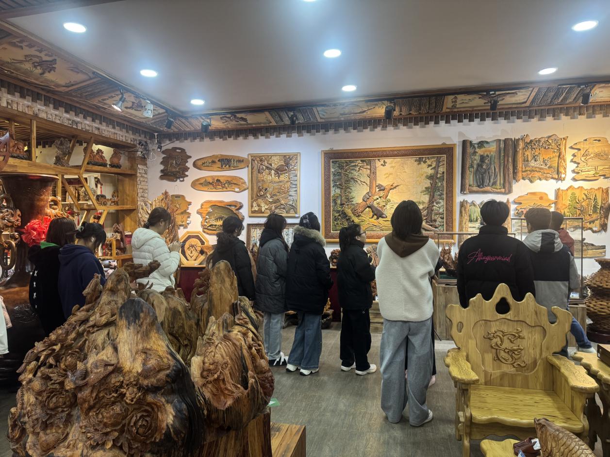 同學(xué)們走進(jìn)興安木藝創(chuàng)意設(shè)計(jì)中心,近距離觀賞木雕擺件、榫卯模型等作品,感受木制工藝品承載的千年文脈與手工溫度,體悟“材美工巧”的傳統(tǒng)造物智慧。省工藝美術(shù)大師、產(chǎn)業(yè)學(xué)院名譽(yù)院長(zhǎng)王美江以“人與木的對(duì)話、心與物的相融”為切入點(diǎn),拆解木藝設(shè)計(jì)核心理念,詳解原木甄選、切割塑形等工藝流程,通過案例解析傳授技法訣竅,讓同學(xué)們讀懂木藝背后的文化密碼與匠心傳承。