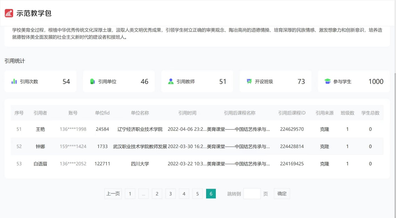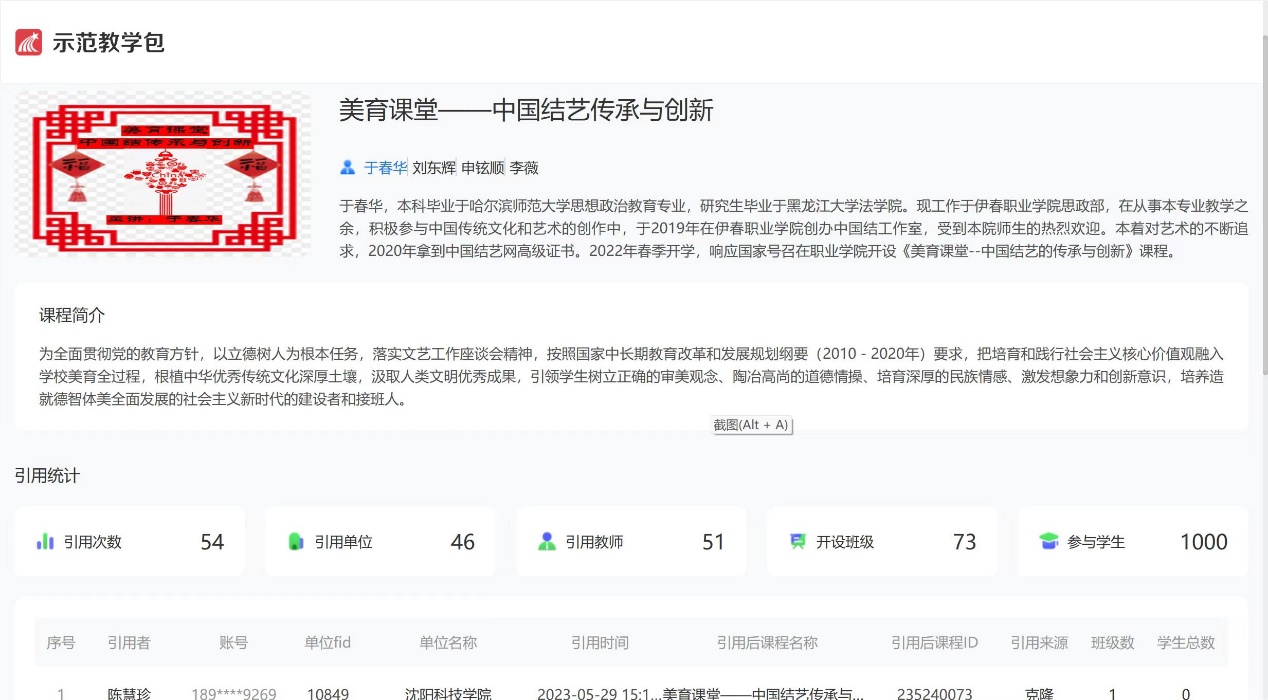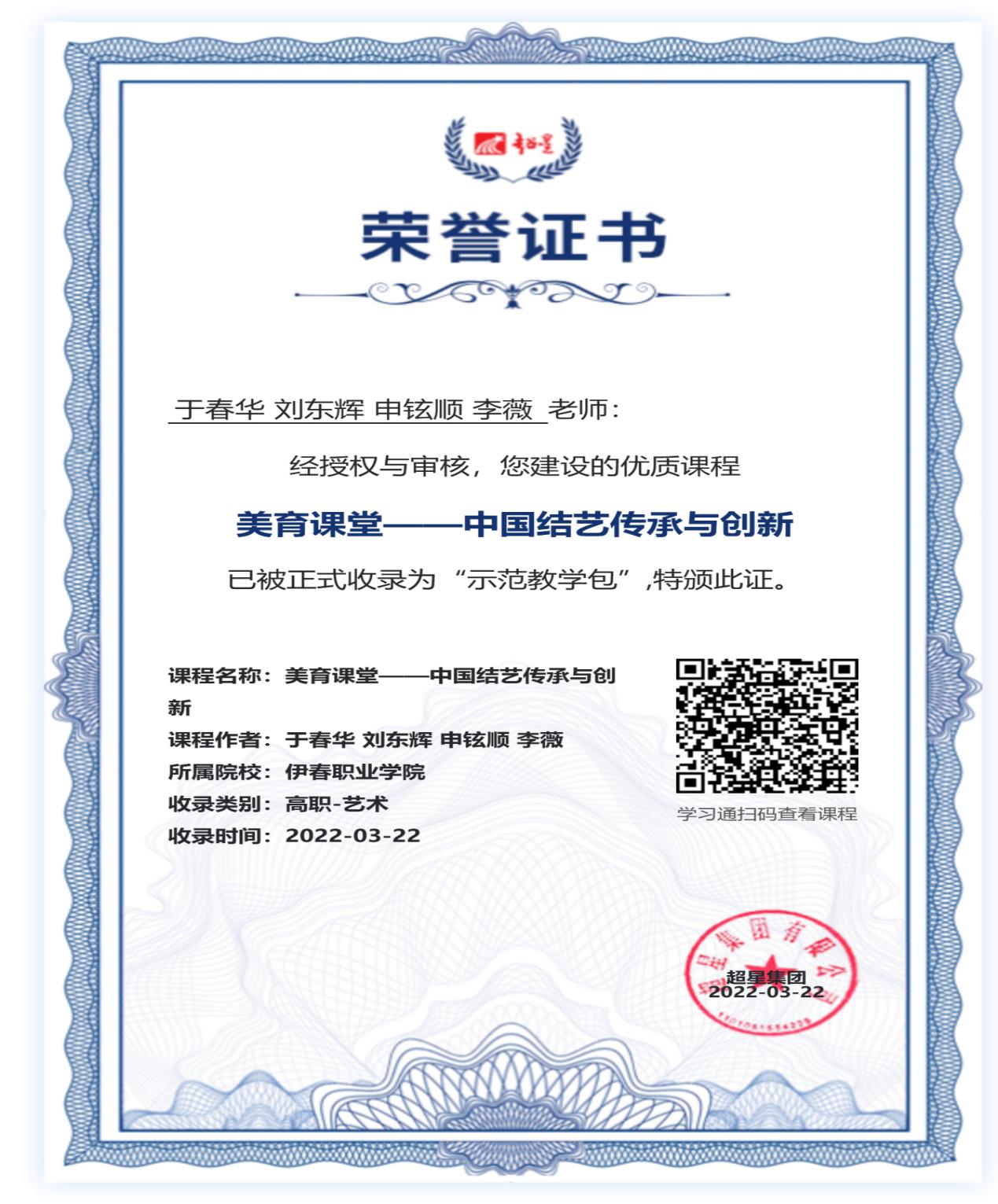 2022年,中國(guó)結(jié)藝工作室借助于超星網(wǎng)絡(luò)學(xué)習(xí)平臺(tái),制作了網(wǎng)絡(luò)課程《美育課堂——中國(guó)結(jié)藝傳承與創(chuàng)新》,這門(mén)課程成功評(píng)為超星學(xué)習(xí)通平臺(tái)示范教學(xué)包,目前被國(guó)內(nèi)的50多所高職院校引用,并作為課程在講課中應(yīng)用。