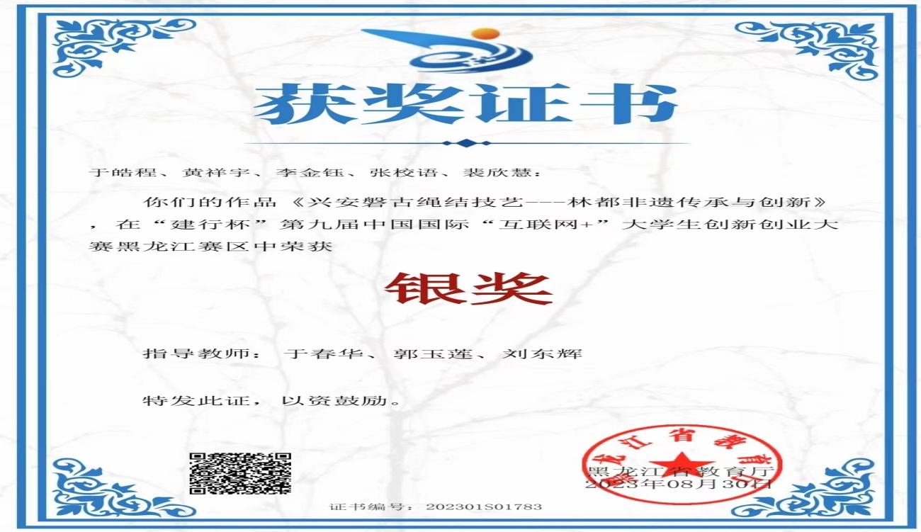 中國(guó)結(jié)藝工作室自成立以來(lái),先后帶領(lǐng)四批學(xué)生參加2020年、2021年和2023年的 黑龍江省“建行杯”互聯(lián)網(wǎng)+創(chuàng)新創(chuàng)業(yè)大賽,取得兩次銅獎(jiǎng),一次銀獎(jiǎng)。同時(shí)還參加了由伊春市舉辦的第二屆創(chuàng)新創(chuàng)業(yè)大賽,取得第三名的好成績(jī)。