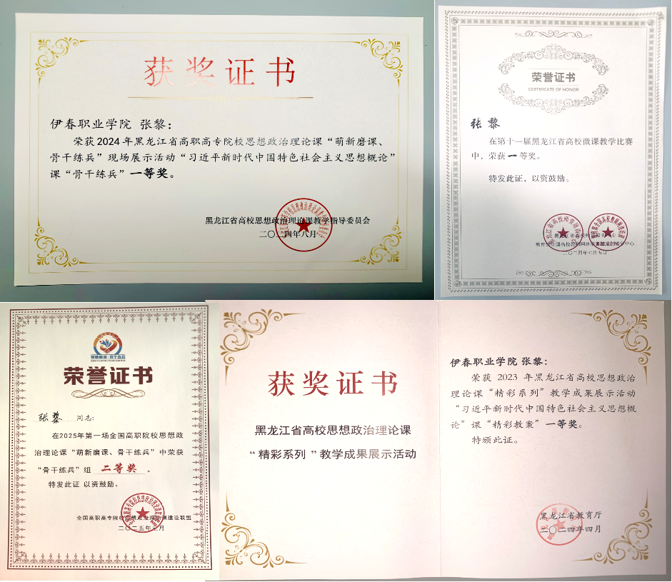 她主講的專題思政課《堅持以人民為中心》經(jīng)過校內(nèi)多輪授課的豐富與打磨,在2024年入選全國高職高專院?!八颊痉墩n巡講”課程。她還先后取得了2022年黑龍江省高校宣傳教育優(yōu)秀工作案例二等獎、2023年黑龍江省教育教學(xué)能力大賽三等獎、2023年黑龍江省高校思想政治理論課教學(xué)成果展示“精彩教案”一等獎、2024年黑龍江省高職高專院校思想政治理論課“萌新磨課暨骨干練兵”現(xiàn)場展示一等獎、2025年全國高職高專院校思想政治理論課“骨干練兵”二等獎、第十一屆和第十二屆黑龍江省高校微課教學(xué)比賽一等獎等等矚目的成績,實現(xiàn)了思想政治教學(xué)部成立以來省級獎項一等獎和國家級獎項零的突破。在參賽的過程中不斷促進(jìn)課堂教學(xué)效果的提升,在取得一系列成績的同時她的課堂得到越來越多來自學(xué)生和同行的認(rèn)可。